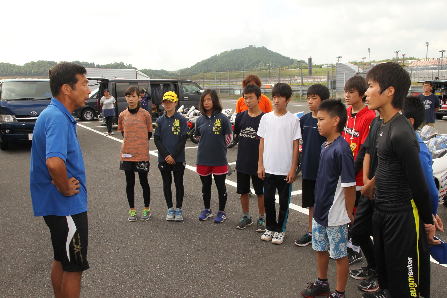 しかも坂田コーチはスパルタ指導。と言っても闇雲に厳しくするのではなく、二度三度言ったことを忘れている場合に厳しく指摘します。「意識の問題だ」と坂田コーチは言います。悪いところやクセを直そうとしたらその事を意識して走らないと絶対に改善しない。坂田コーチ自身も世界グランプリを走っている時に、タンクの上に“●●コーナーでは顎を引く”などメモを貼っていたそうです。走りに集中してしまうとやるべきことを“忘れてしまう”。だからメモを貼って、意識して走っていたそうです。基本を何度も何度も反復練習する、しかも、それを意識しながら走る。その指導をひとりひとりに細かくアドバイスしています。
